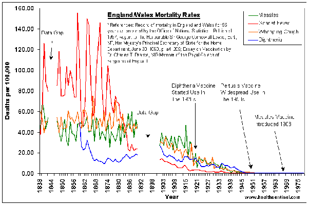 Here’s just some of the evidence upon which this is based. Note the decline of diseases prior to vaccination programs such as this graph or mortality rates due to various diseases in England and Wales from 1838 to 1978, which could be viewed more clearly by clicking on it to magnify it: